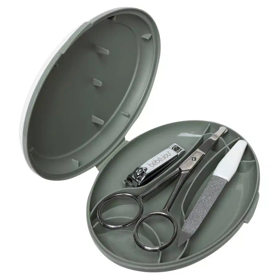 A Bébé-jou Baba manikűr szett egy 3 darabos rozsdamentes acél kozmetikai készlet praktikus, kompakt tokban, mely ideális a baba körmeinek ápolására. A készlet tartalma egy lekerekített végű babaolló, körömreszelő és körömcsipesz. A műanyag tok segít tisztán tartani az eszközöket, könnyen zárható és nyitható. A szett tökéletes megoldást nyújt gyermeke körömápolására, de minden esetben fokozott figyelem szükséges a műveletnél. Ajánlott minden használat előtt megtisztítani, újszülötteknél pedig alkohollal fertőtleníteni.