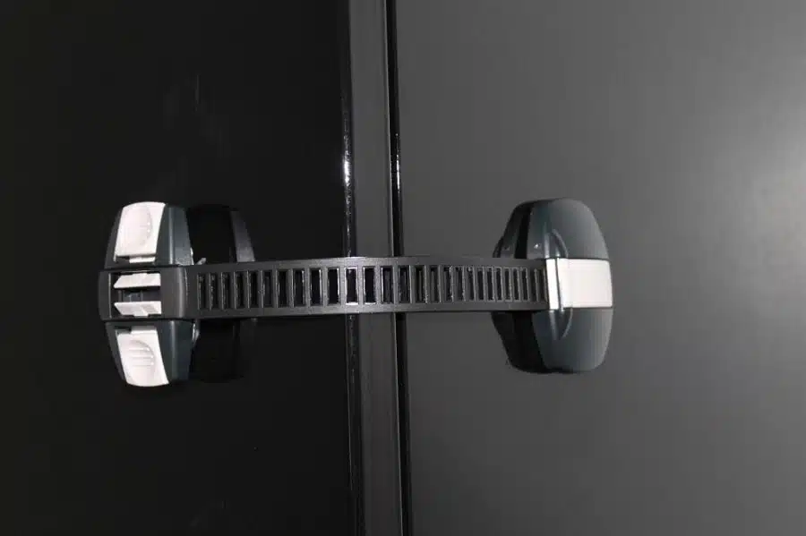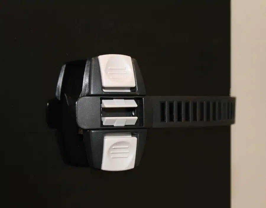 Univerzális zár. Biztosíthatja vele, többek között, szekrényajtók, fiókok, hűtők, fagyasztók és szárítók ajtaját. Próbálja úgy elhelyezni, hogy a gyermek ne érhesse el. Kioldása az egymással szemben elhelyezett kioldógombok egyszerre történő megnyomásával lehetséges. Hossza több fokozatba állítható. Egyenes felületekre ragasztócsíkkal (öntapadó), egyenetlen felületekre csavarokkal rögzíthető.