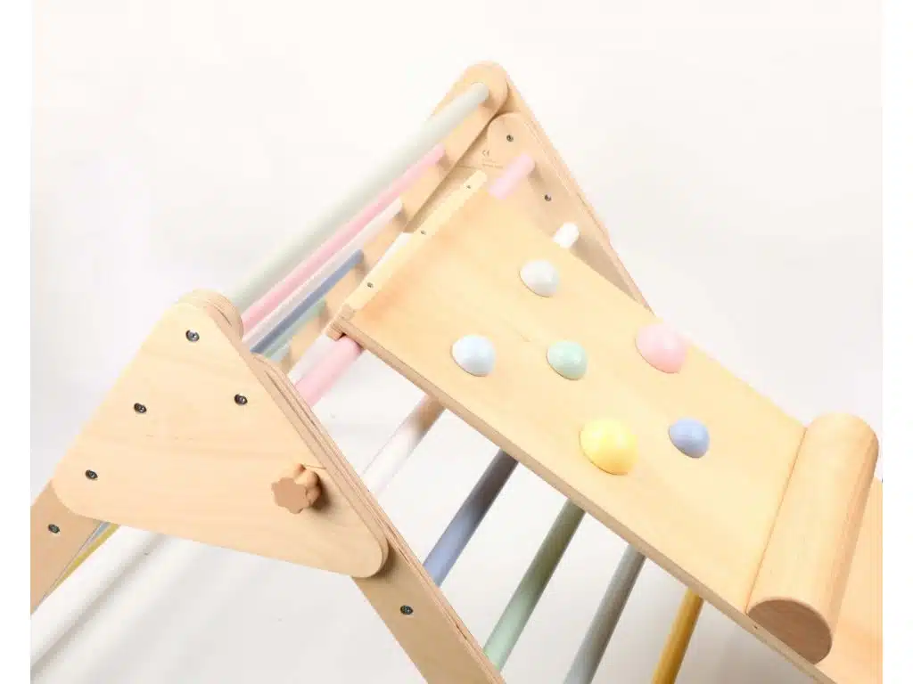 - Elegáns design, a Pikler-féle háromszög mászóka és a tábla semleges színű – természetes fa pasztellszínekkel kombinálva.