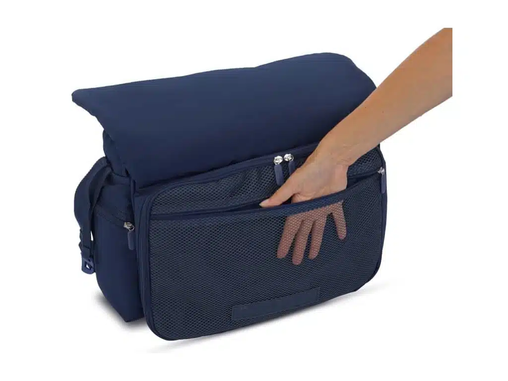 - Az első oldal belsejében található még egy cipzárral zárható zseb, külön rekeszekkel a higiéniához szükséges termékek, valamint a pelenkázó lap tárolására.
